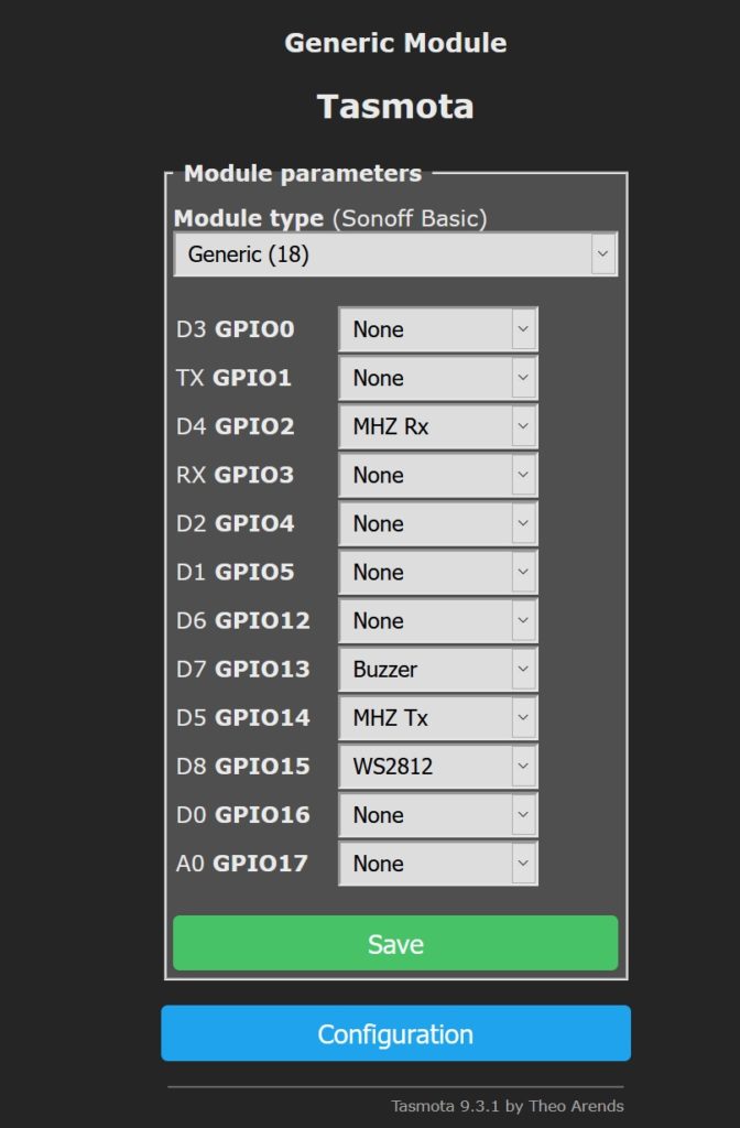 Mit Configure Module kommt man zur Gerätekonfiguration, bei der die angeschlossenen Sensoren/Komponenten den verwendeten GPIO Pins zugeordnet werden. Folgende Einstellungen werden benötigt: