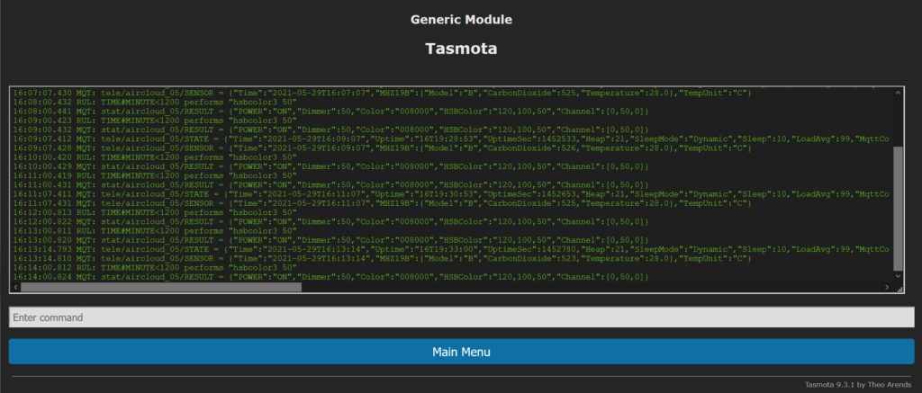 Wenn man MQTT enablet hat, müssen noch unter Configure MQTT die MQTT Parameter (Server, Credentials, Topics) eingegeben werden. Tasmota meldet seine Daten dann alle 5 Minuten dem MQTT Server. Dieses Intervall kann unter Configure Logging – Telemetry Periode verändert werden (oder später über die Console).