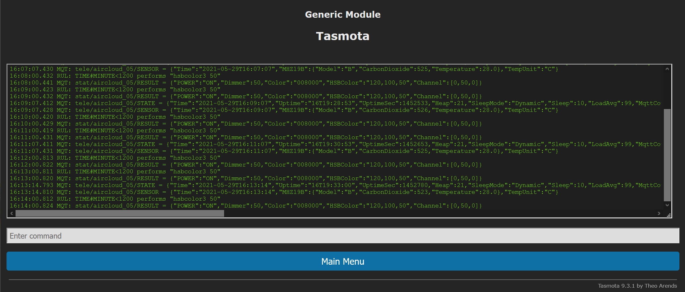 Magic happens here! Wir pairen den CO2 Sensor mit der LED-Farbe! Ab sofort ändert sich die Farbe der LEDs entsprechend der Messergebnisse des MH Z19B Sensors. Fix voreingestellt ist grün bis 800ppm, rot über 1200ppm und ein Farbverlauf dazwischen. Diese Grenzen können nur mit einem Kompilieren des Binaries geändert werden, haben sich aber als gut gewählt herausgestellt.timezone 99