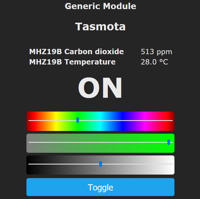 Im Hauptmenü sollten jetzt nach kurzer Zeit die Messwerte des MH Z19B erscheinen. Die gemeldete Temperatur entspricht allerdings nicht der Raumtemperatur und manche Modelle des MH Z19B melden auch Werte um 0. Für eine Temperaturmessung müssten wir dem Gerät noch einen BMP280 spendieren. Da wir LEDs konfiguriert haben, erscheinen im Hauptmenü auch die entsprechenden Regler dafür, die auch sofort funktionieren.