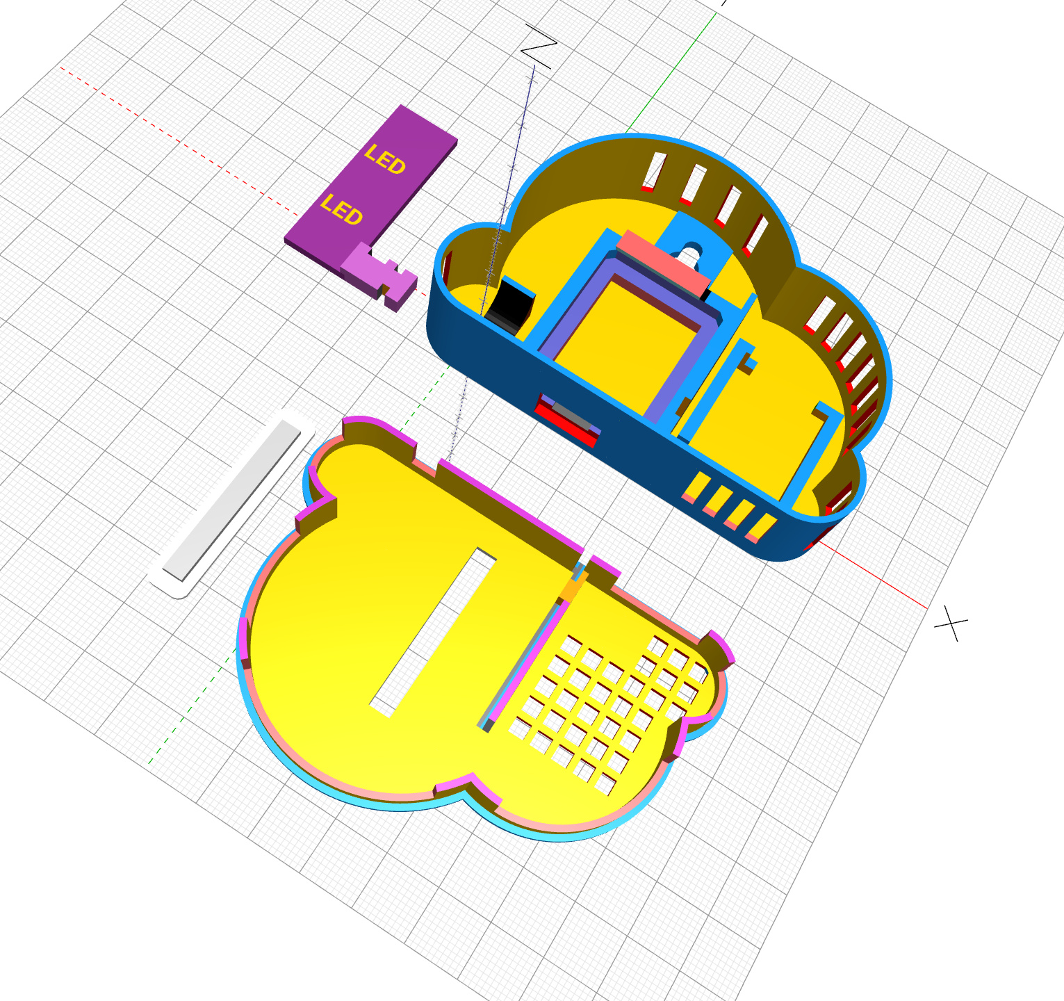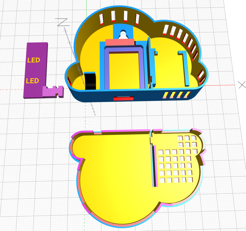 The housing in its form corresponds to the ‘cloud’ on behalf of the project and was printed with a 3D [Anycubic i3 Mega, Test] printer. A first idea can be found on Thingiverse [Air quality CO2 sensor by Luc3as]. In the end, however, the space and thermal conditions were not good enough and so I designed my own housing, which is also suitable for wall mounting.